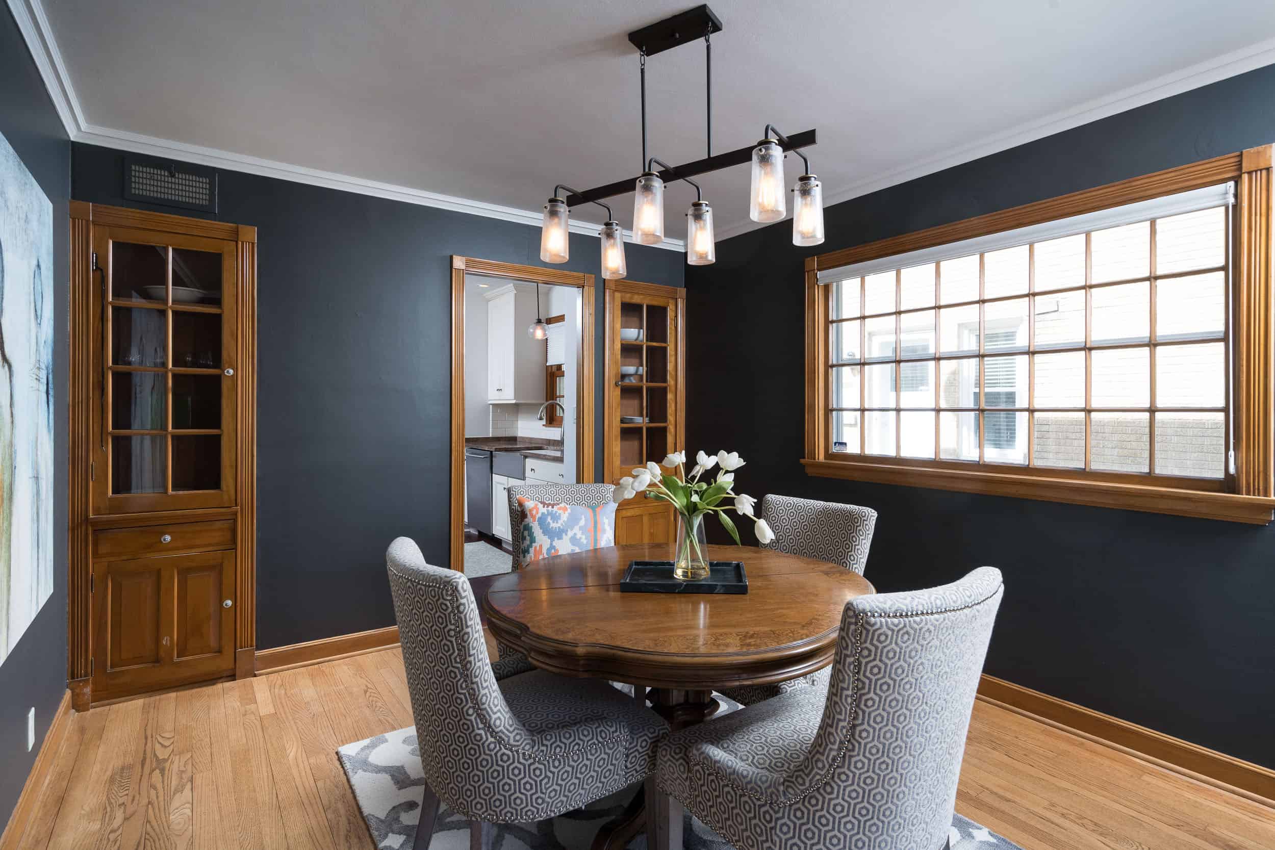 ● Sherwin-Williams’ Iron Ore bathes the dining room, making a bold, dramatic statement