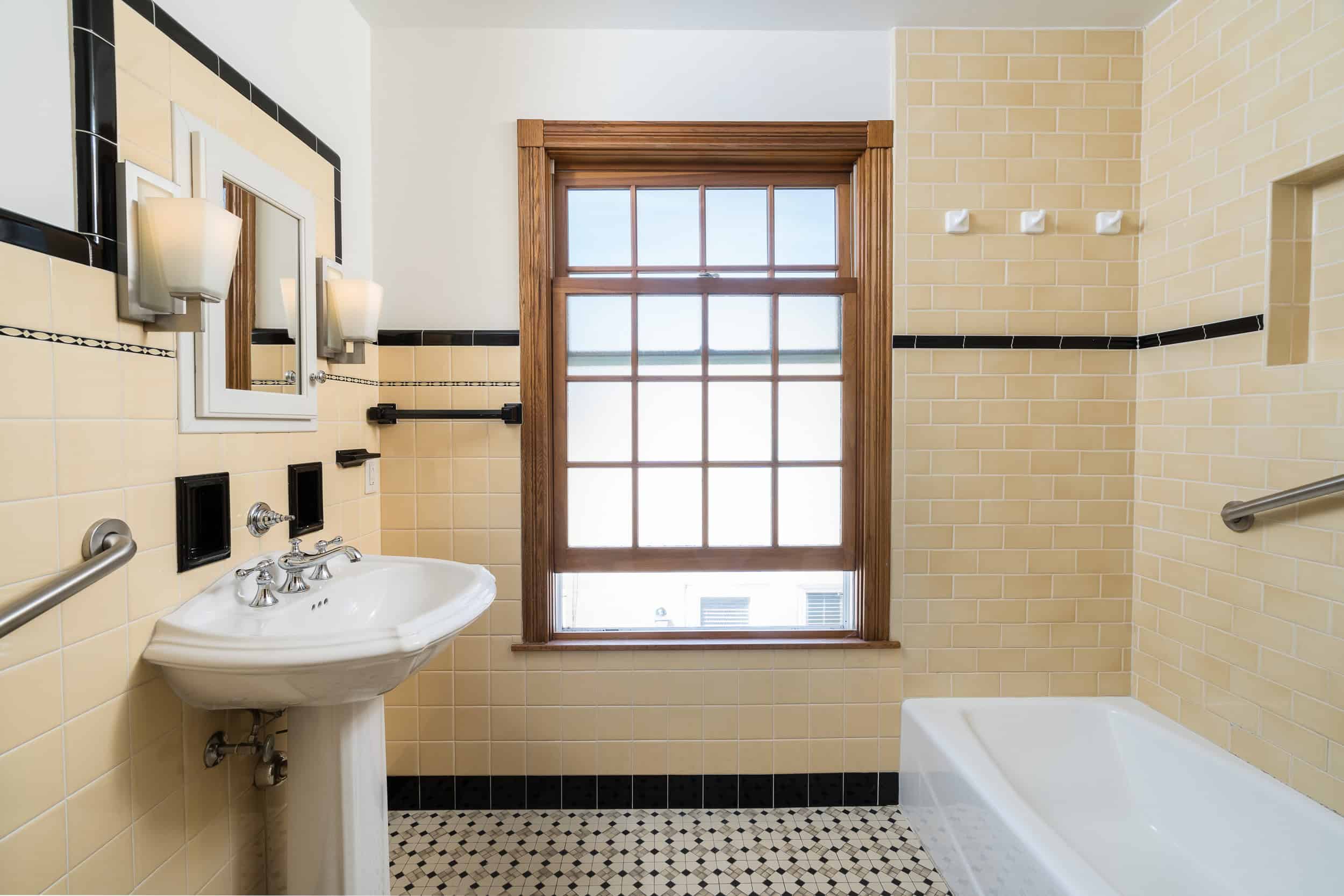 ● To not detract from the original tile in the upstairs bath, we keep the wall color neutral
